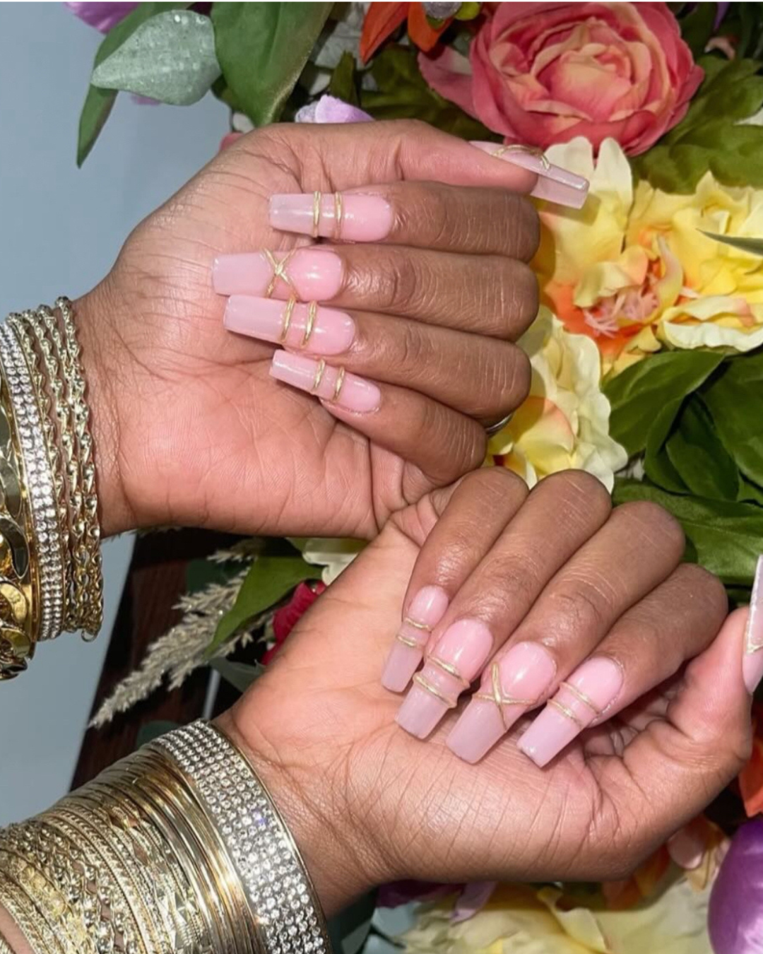 Soft pink nails with gold 3D lines on them. Super chic.